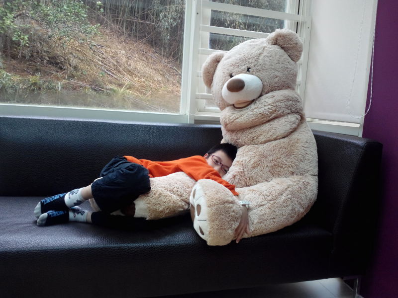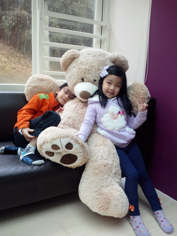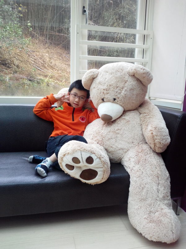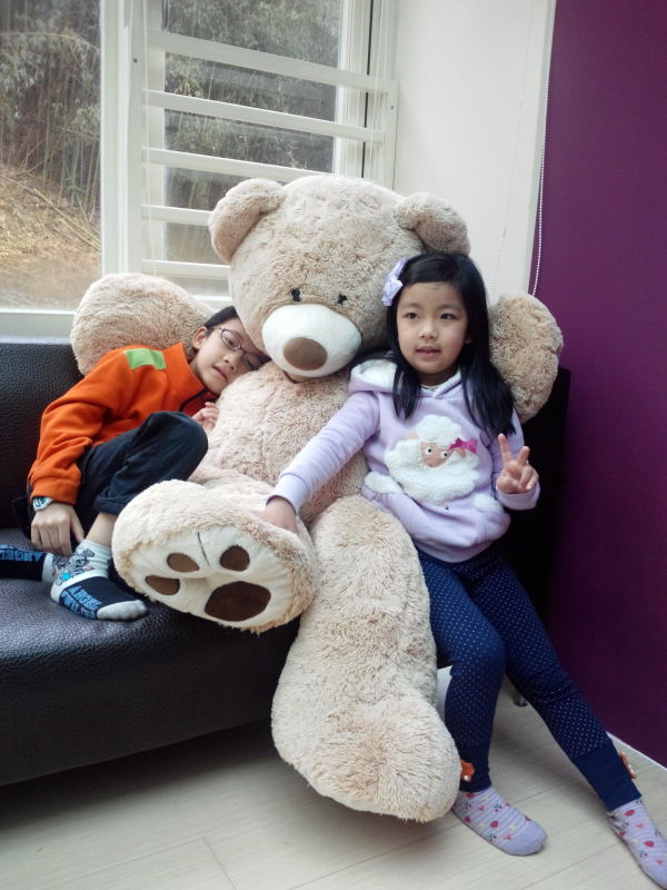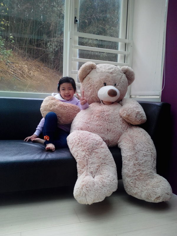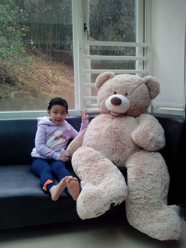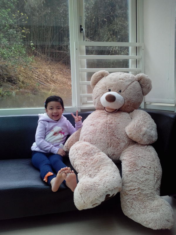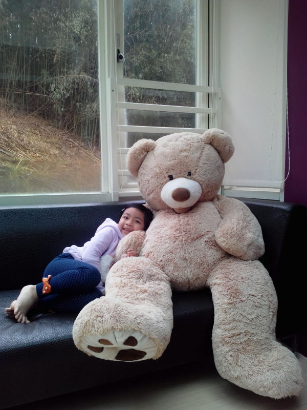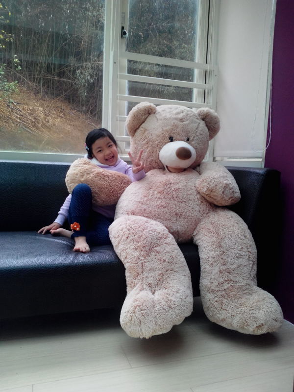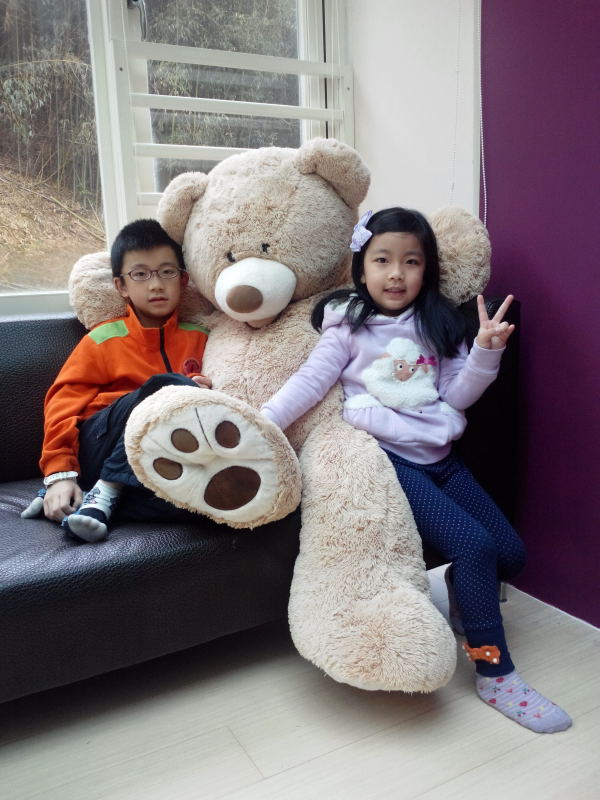 小馨馨率先與房內擺放的大熊布偶合影